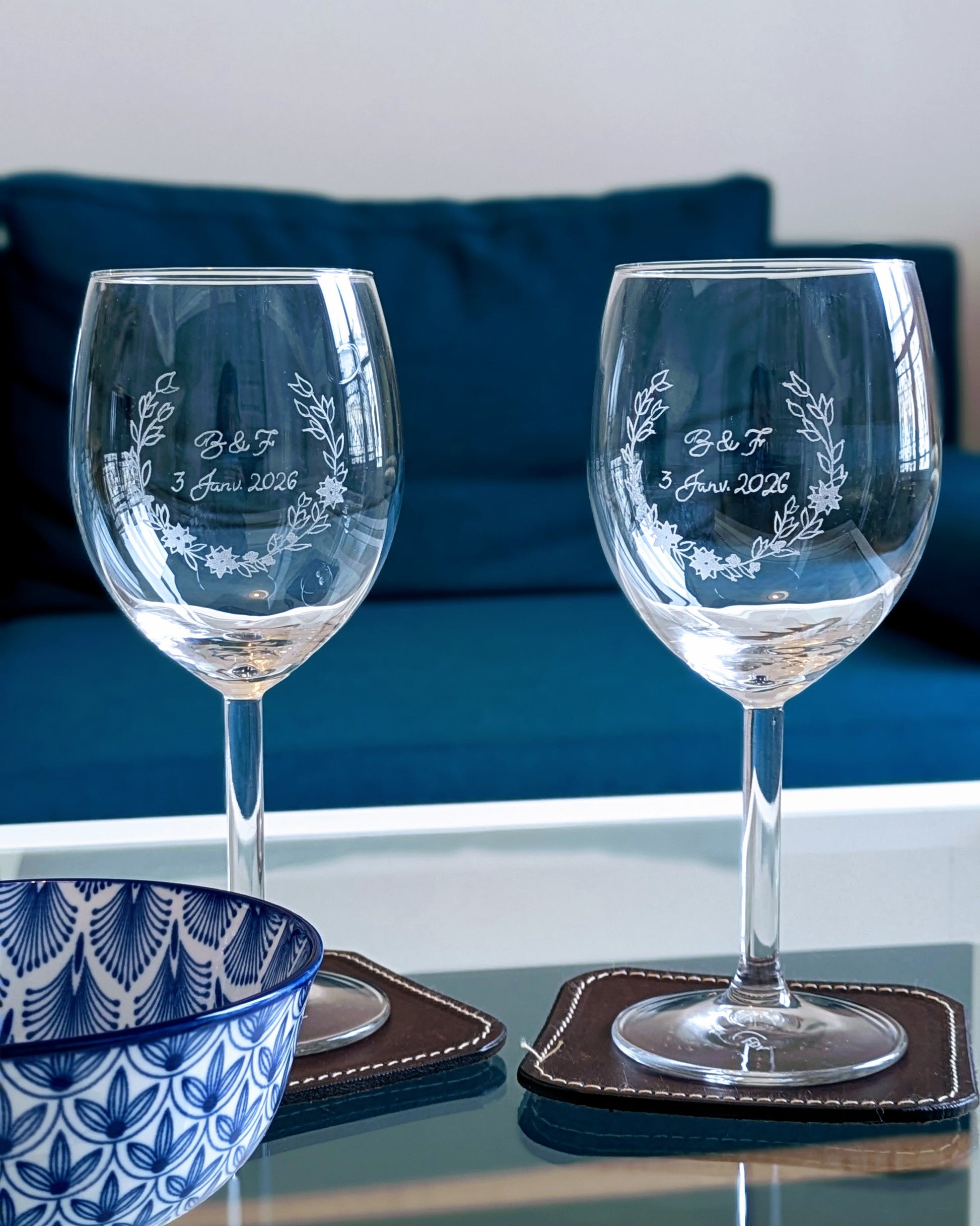 Ce lot de 2 verres à vin gravés à la main allie raffinement et originalité. Chaque verre est personnalisé selon vos envies pour en faire une pièce unique.