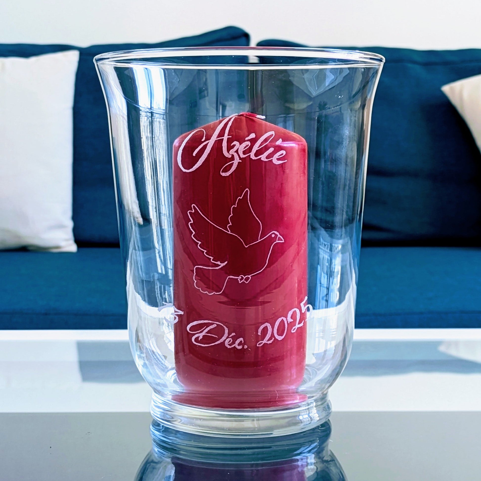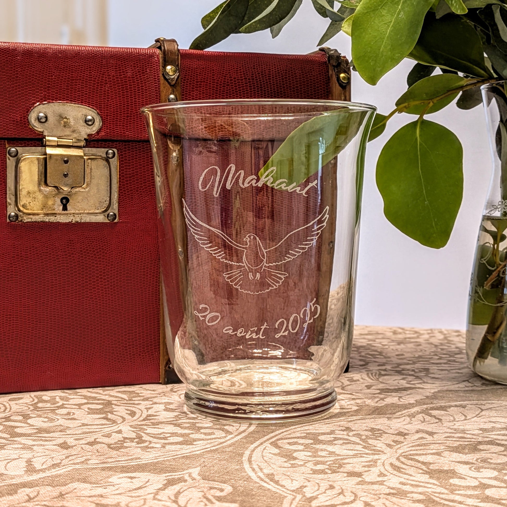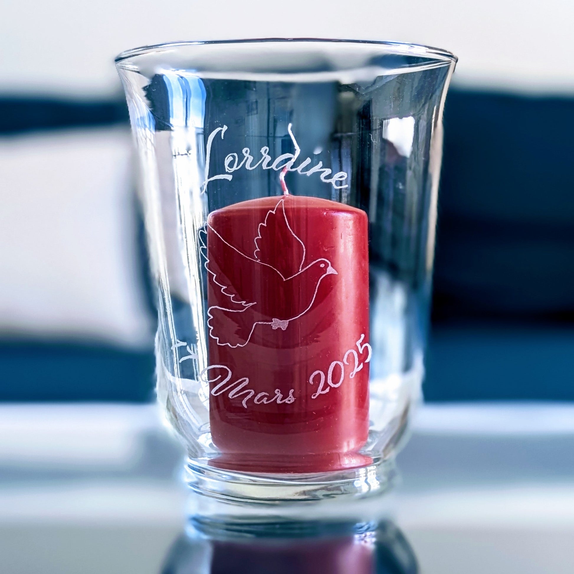 Gravé à la main, ce bougeoir en verre personnalisable apporte une touche de douceur et d’élégance à votre intérieur.
