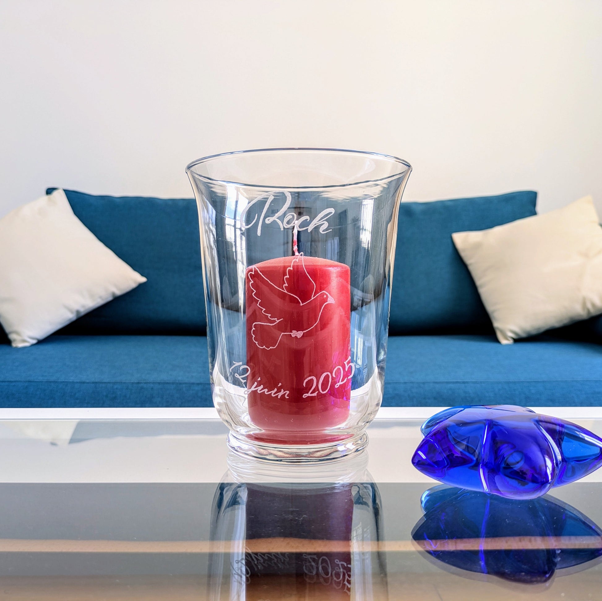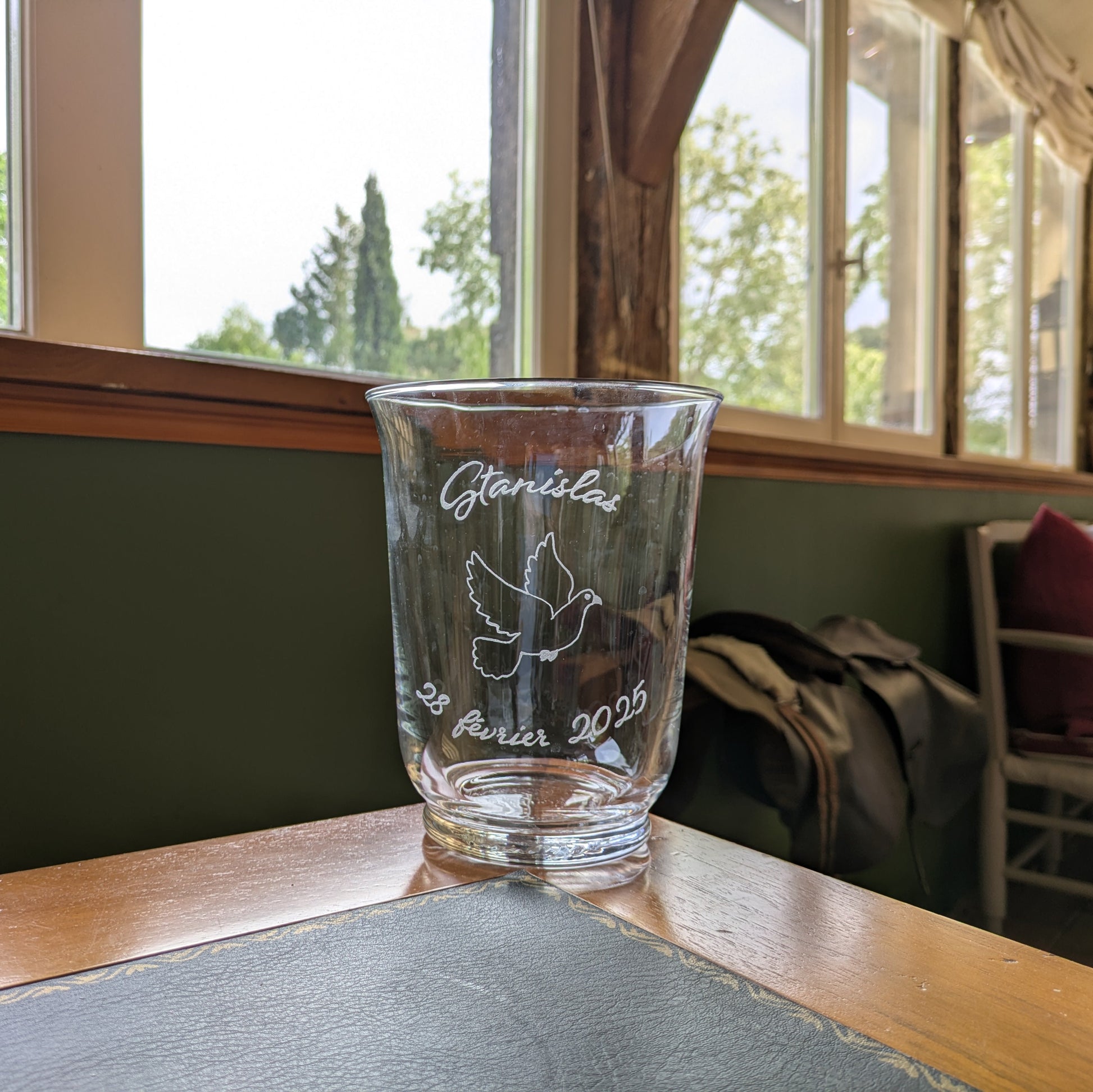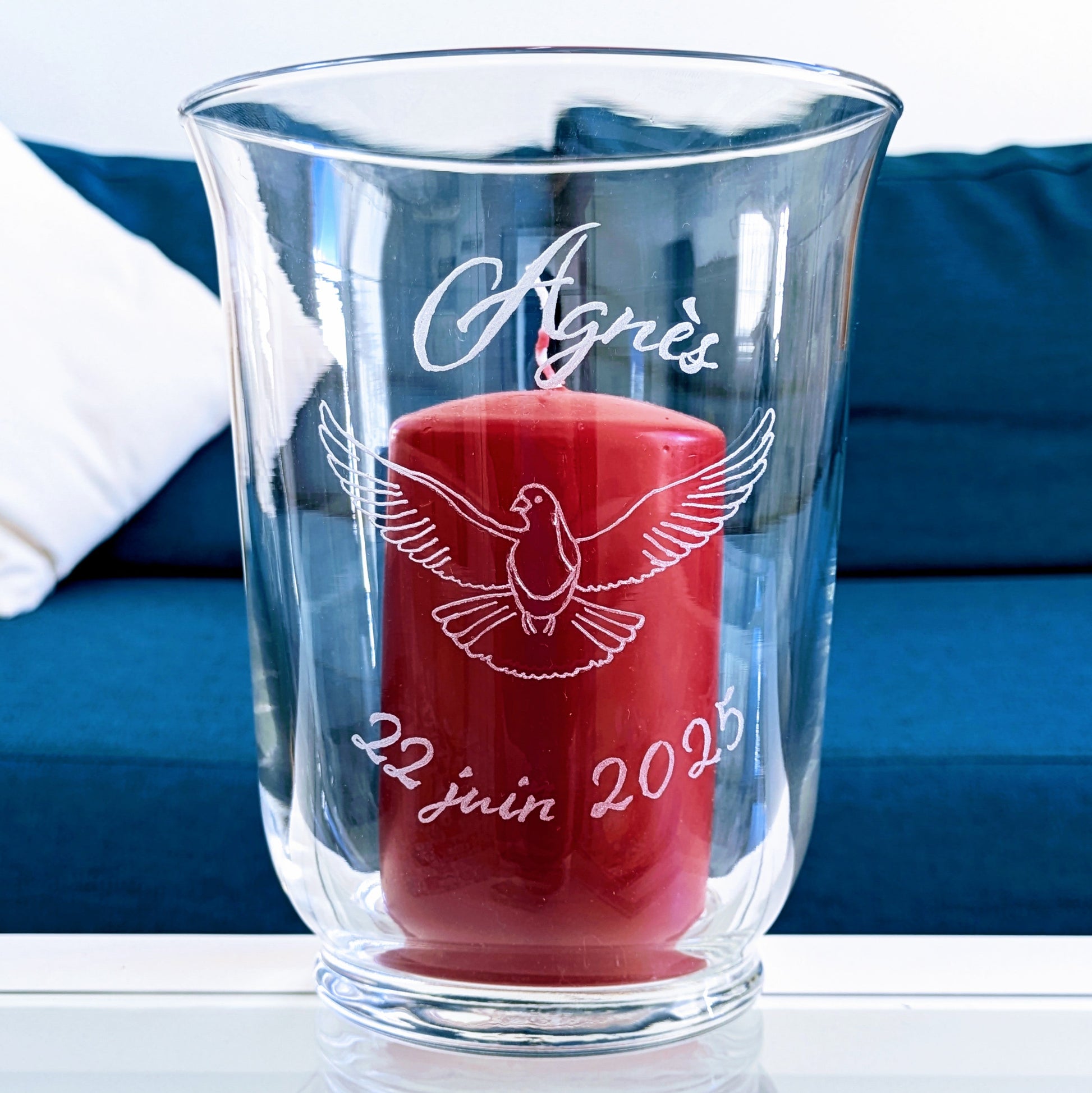 Gravé à la main, ce bougeoir en verre personnalisable apporte une touche de douceur et d’élégance à votre intérieur.
