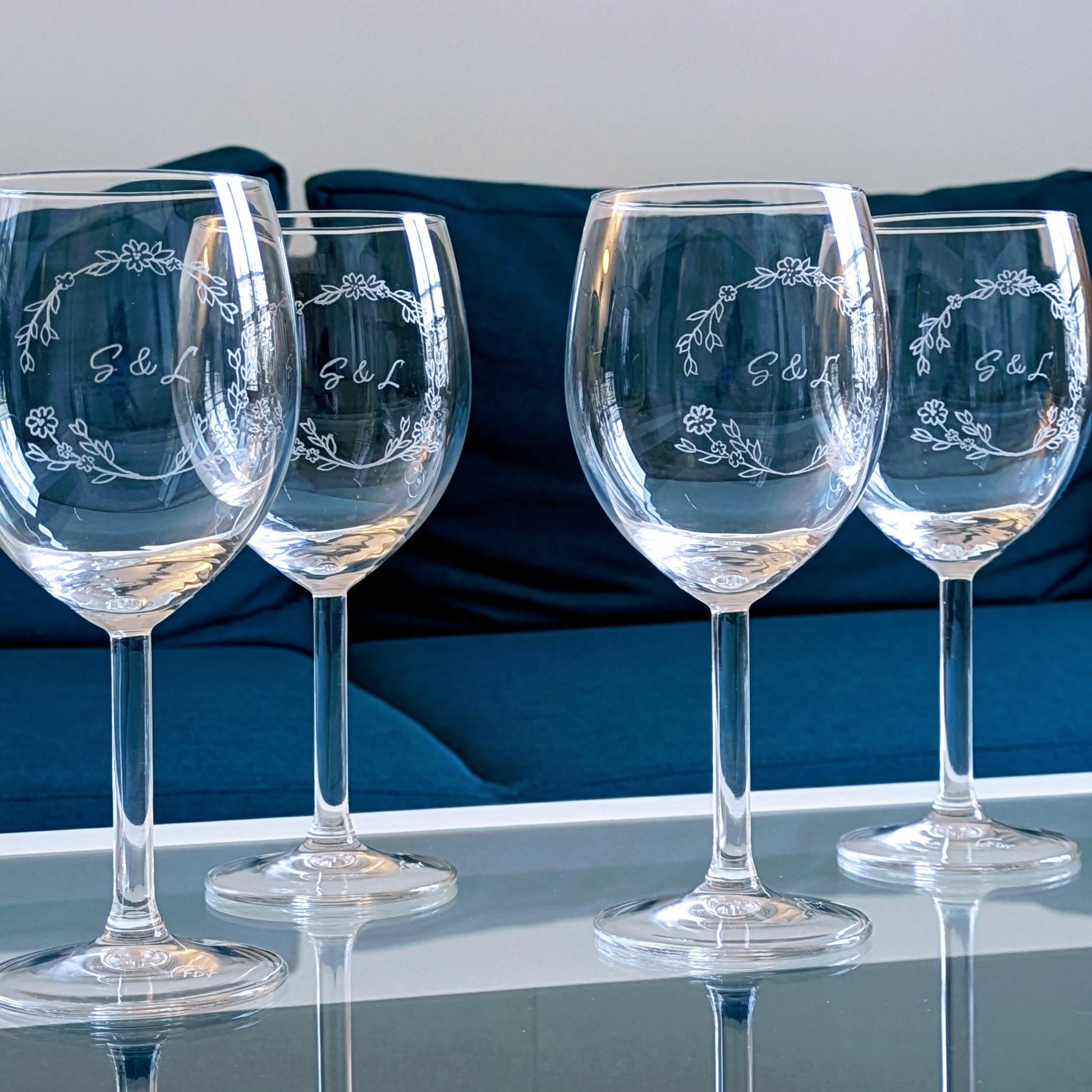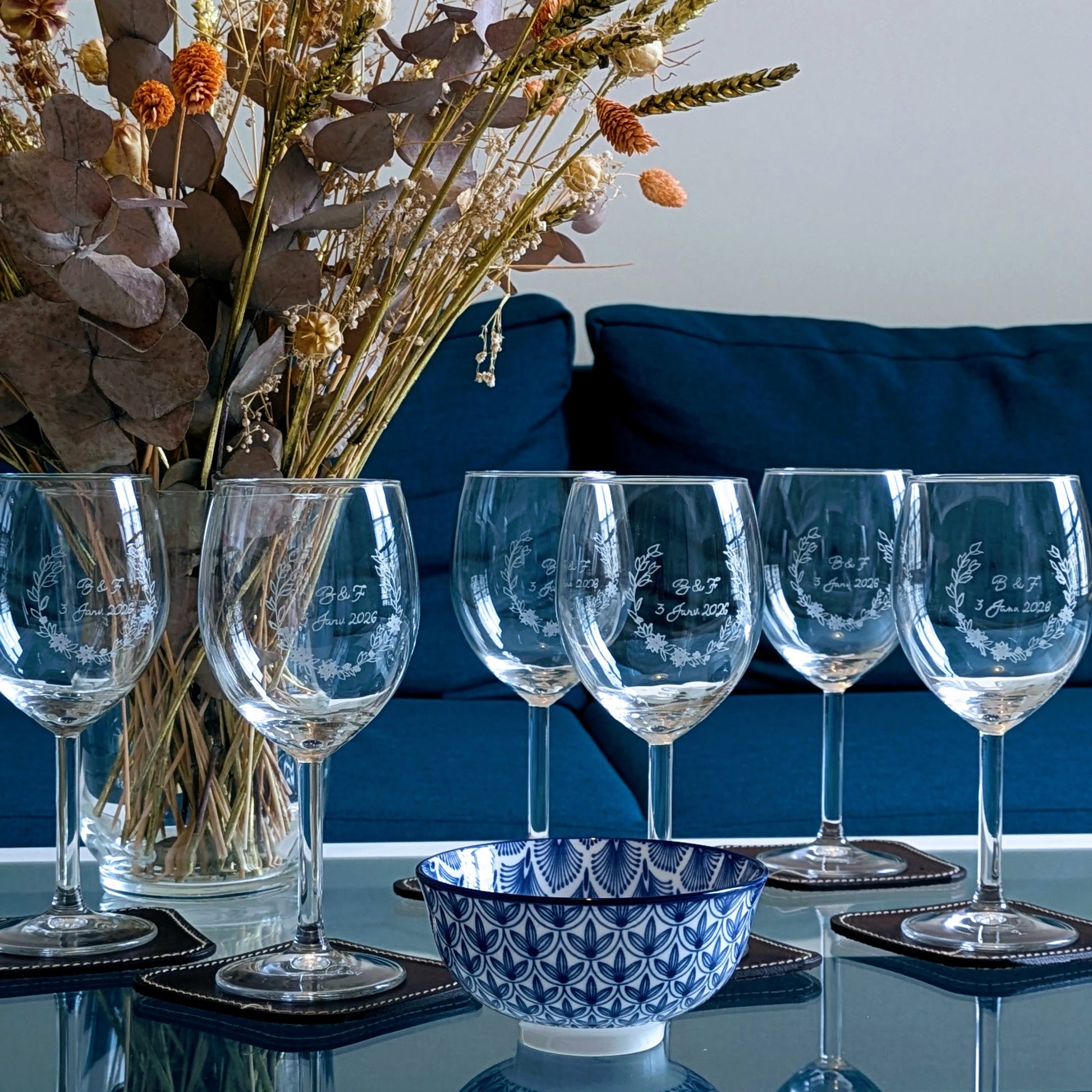 Ce lot de 6 verres à vin gravés à la main allie raffinement et originalité. Chaque verre est personnalisé selon vos envies pour en faire une pièce unique.